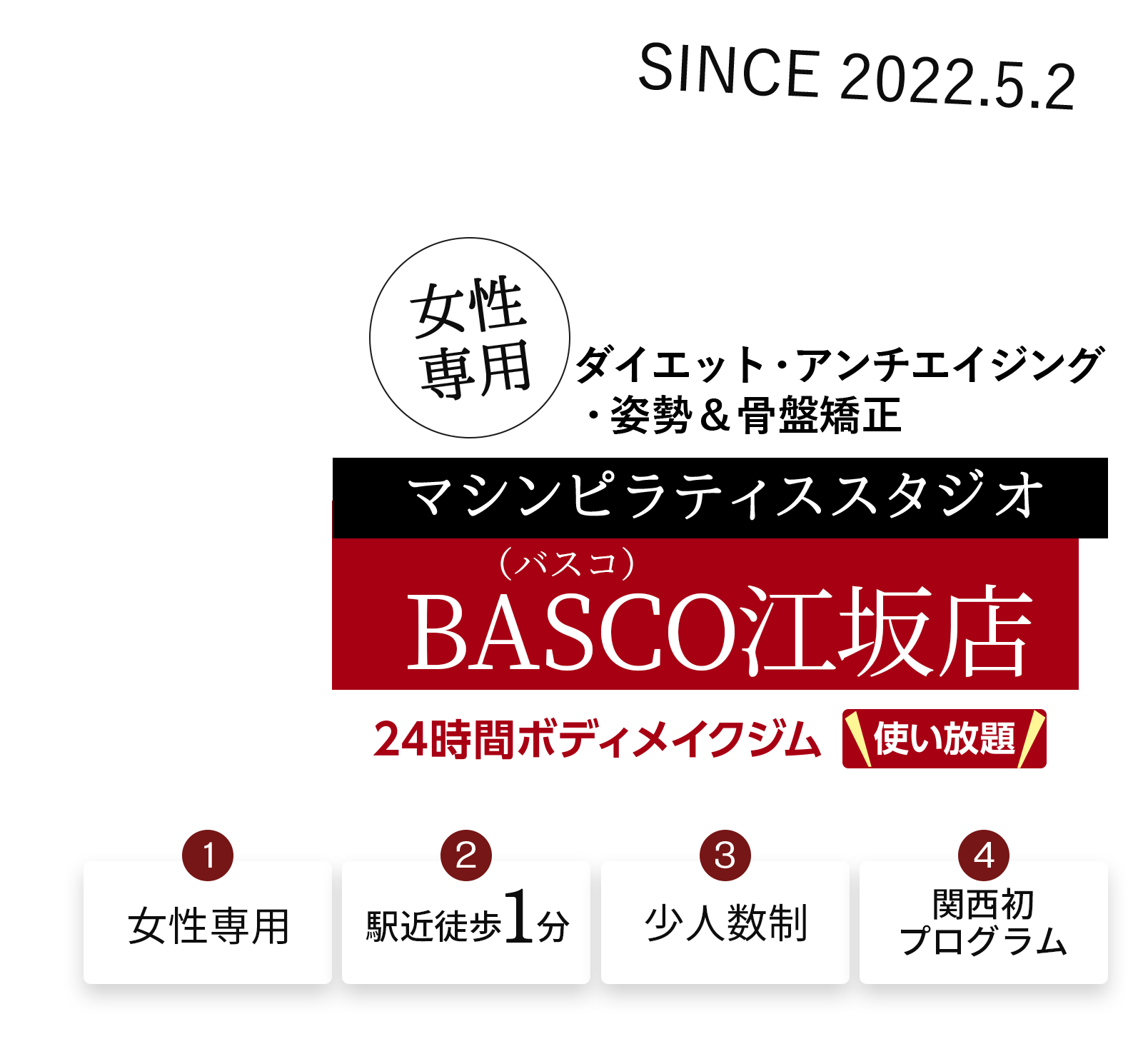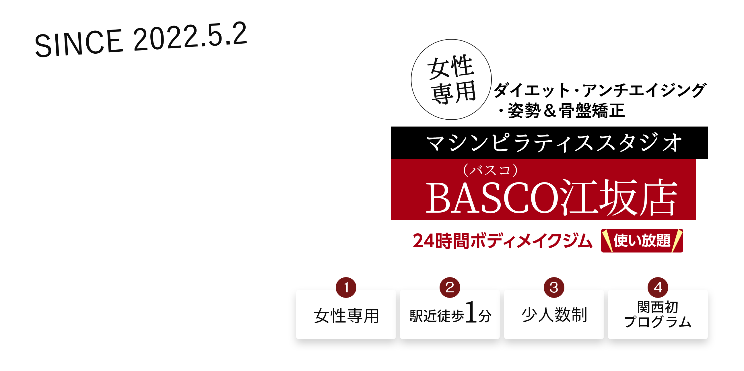 「女性専用マシンピラティススタジオ|バスコ江坂店」は、ピラティスでカラダが整う、痩せる、変わる。唯⼀のオリジナルメソッドで女性の健康的で美しいカラダを末永く維持し、いつまでも楽しく、豊かな毎日を送っていただくためのグループリフォーマーピラティススタジオです。